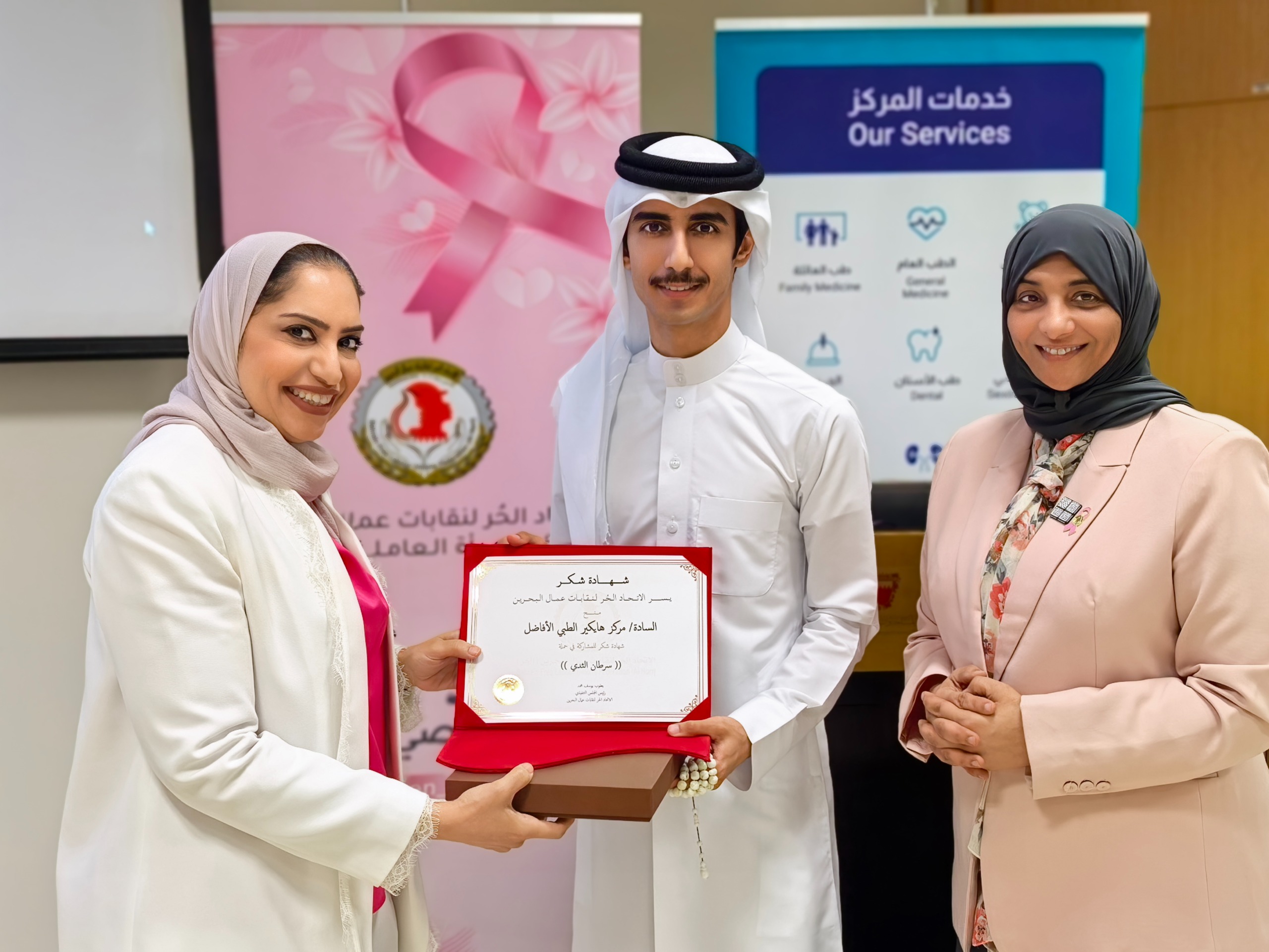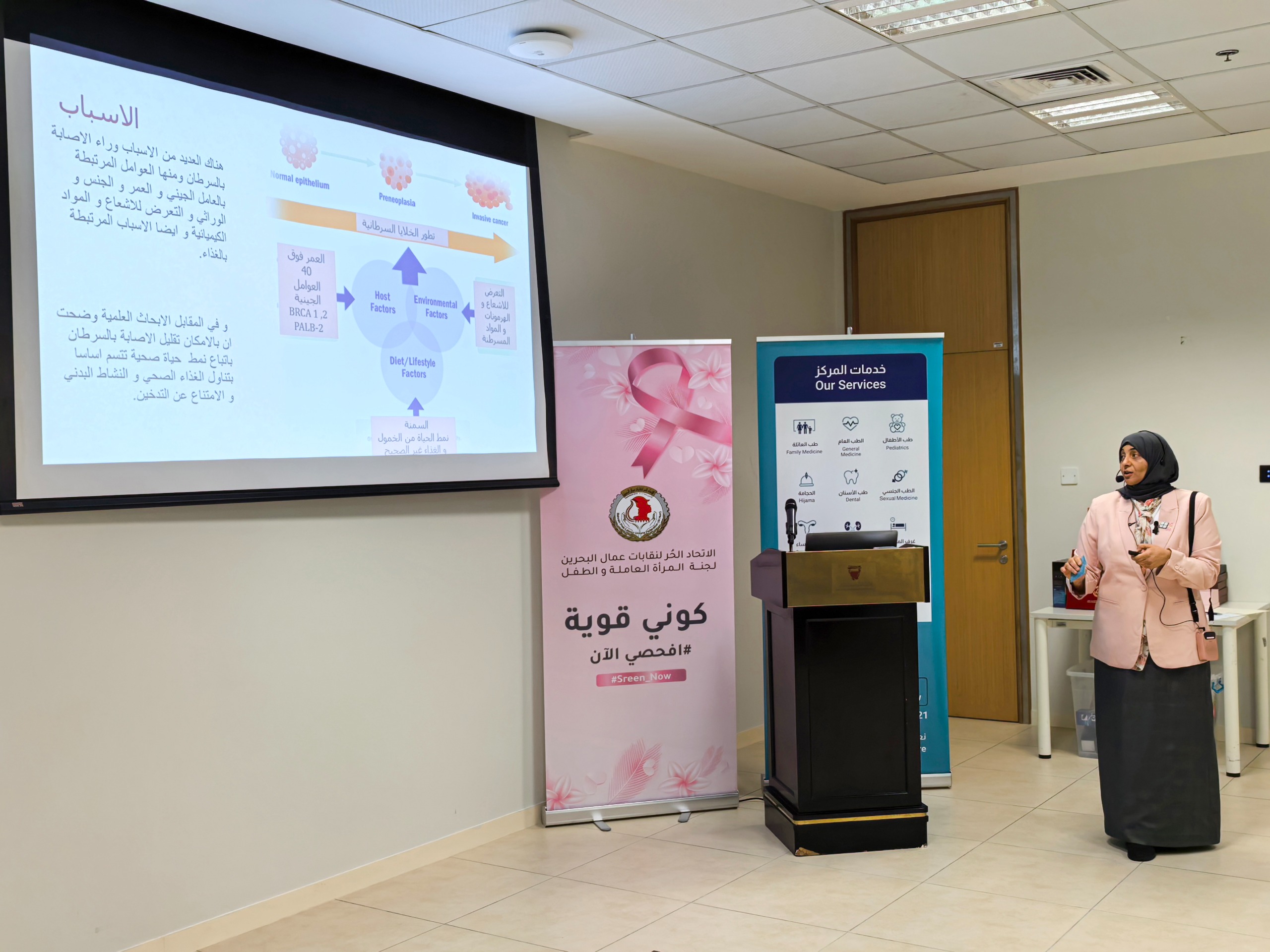 في إطار الحملة السنوية للتوعية بمرض سرطان الثدي التي ينظمها الاتحاد الحُر لنقابات عمال البحرين خلال شهر أكتوبر من كل عام، أقامت لجنة المرأة العاملة والطفل بالاتحاد الحر بالتعاون مع مركز هايكير الطبي محاضرة توعوية بعنوان "أقوياء معاً"، قدمتها الدكتورة سنية عبدالله الصالحي استشارية طب العائلة تخصص طب غذائي والسكر، وذلك في مقر الجهاز بحضور عدد من الموظفات العاملات بالجهاز.