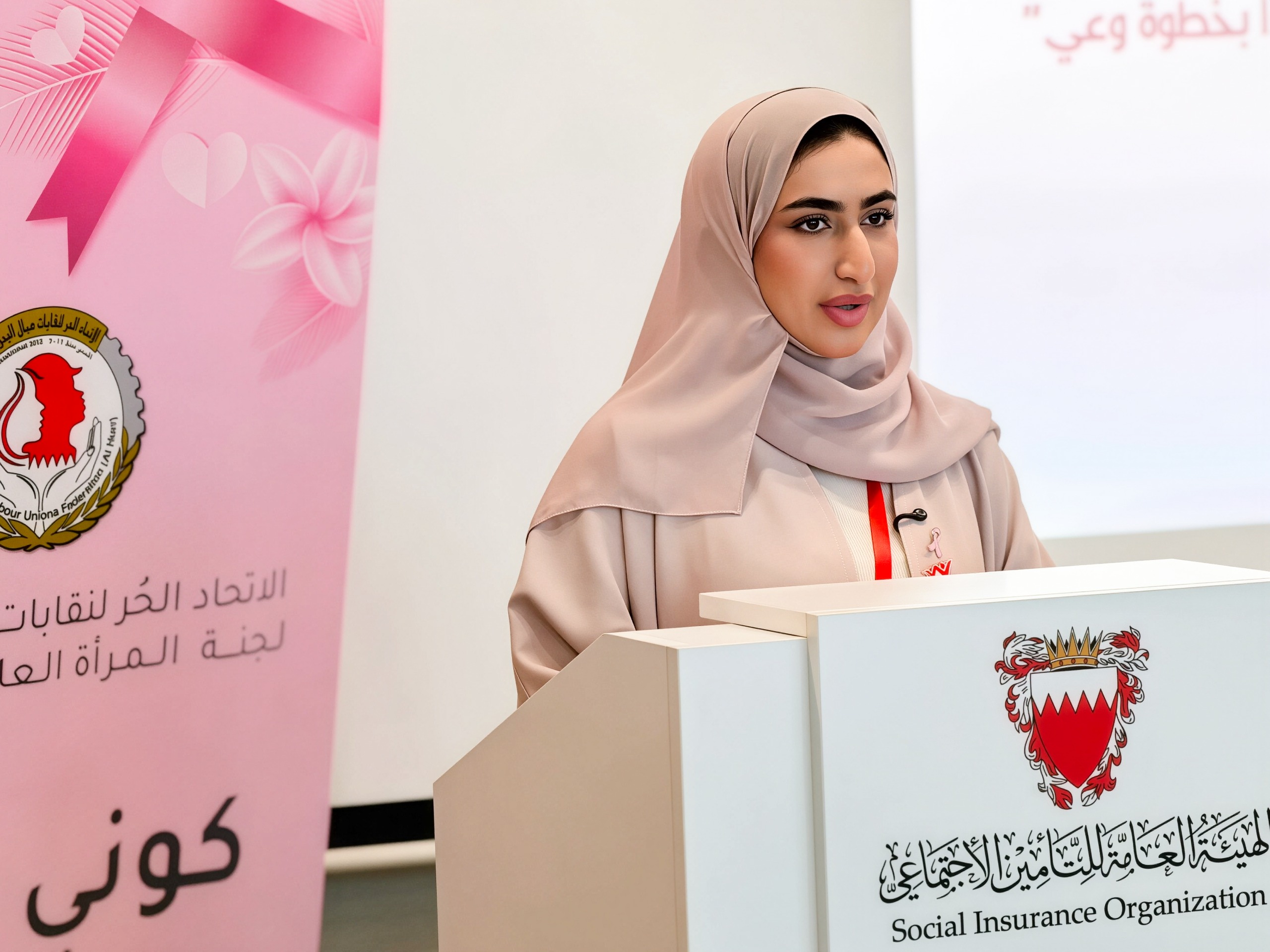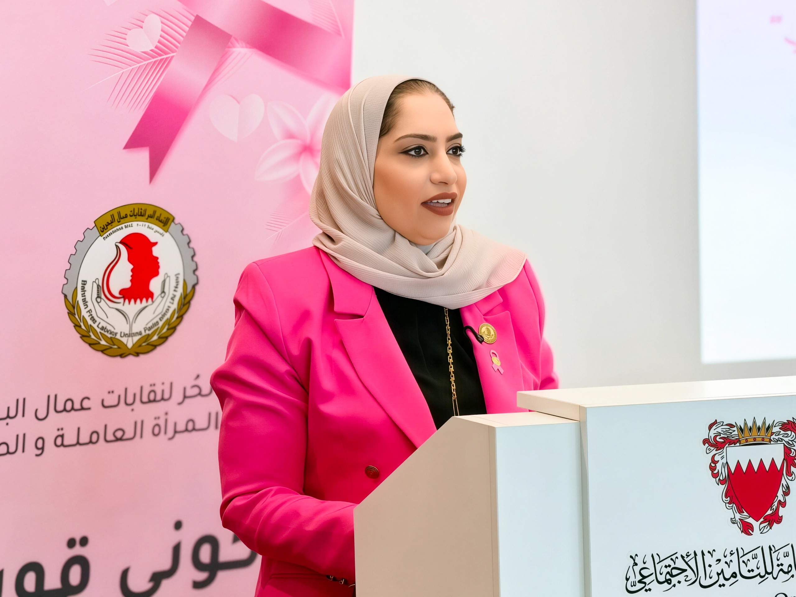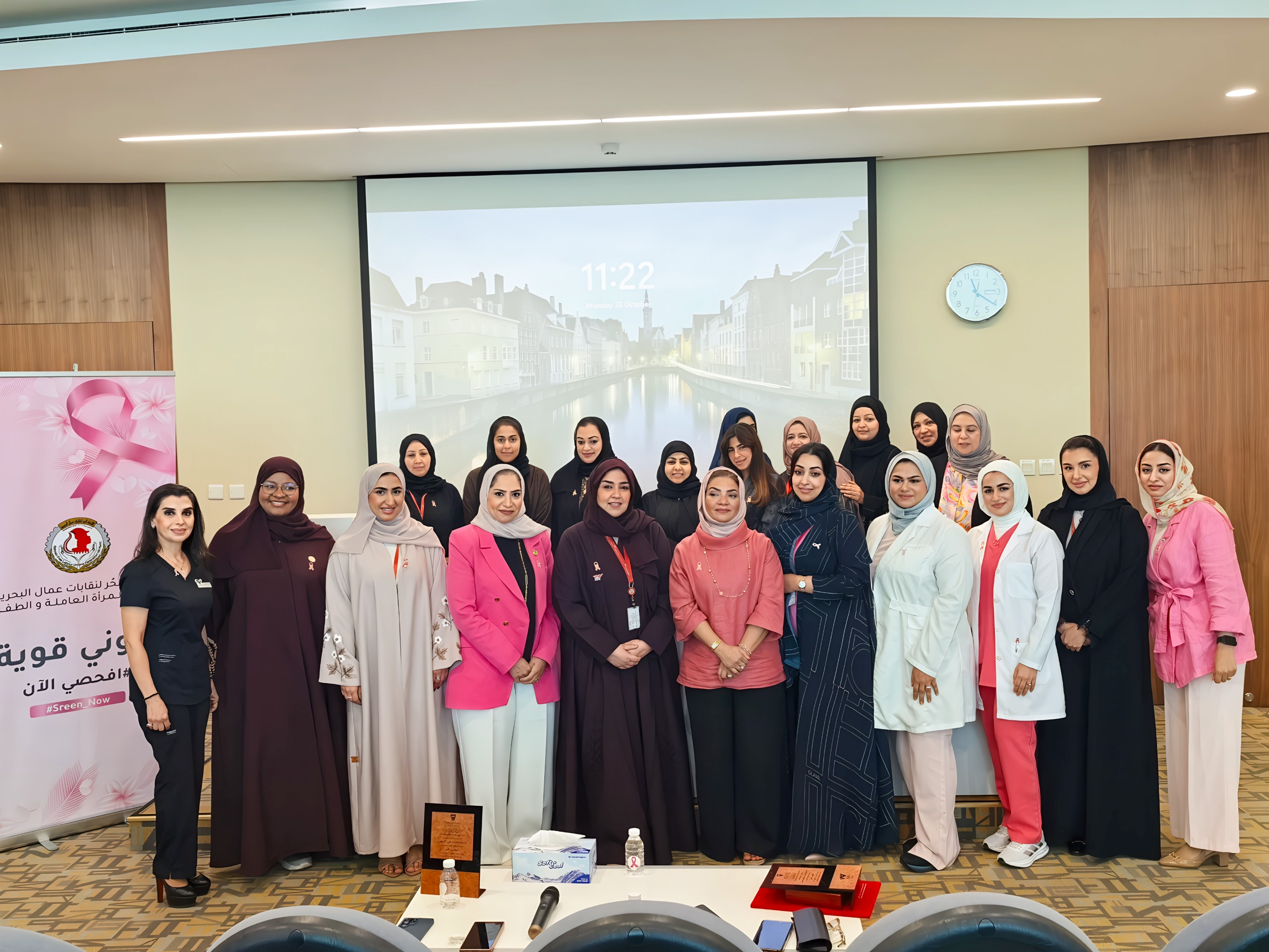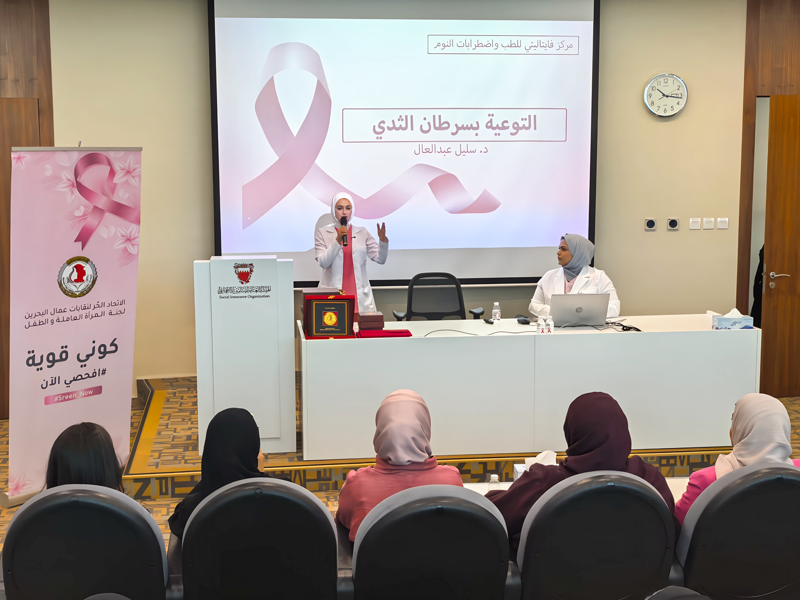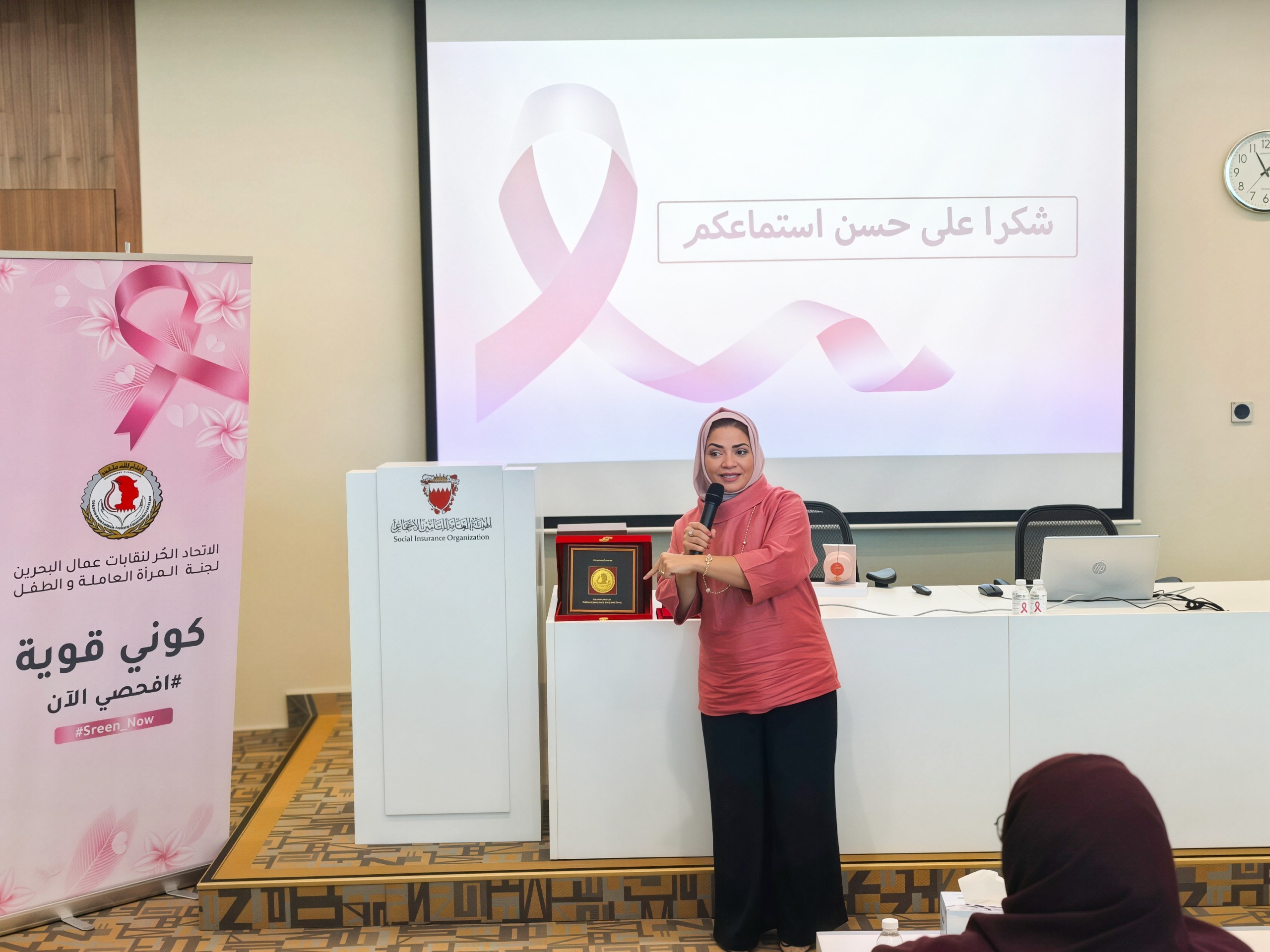 في إطار الحملة التوعوية لشهر أكتوبر الوردي، نظمت لجنة المرأة العاملة والطفل بالاتحاد الحُر لنقابات عمال البحرين محاضرة توعوية حول سرطان الثدي وطرق الوقاية منه، وذلك بالتعاون مع الهيئة العامة للتأمين الاجتماعي ومركز فايتاليتي للطب واضطرابات النوم.