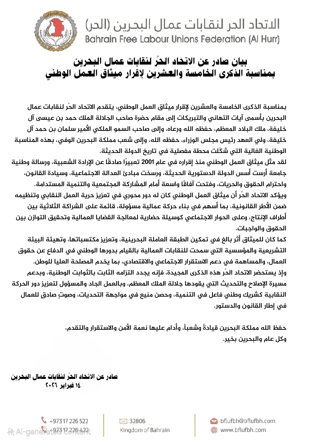 بمناسبة الذكرى الخامسة والعشرين لإقرار ميثاق العمل الوطني، يتقدم الاتحاد الحُر لنقابات عمال البحرين بأسمى آيات التهاني والتبريكات إلى مقام حضرة صاحب الجلالة الملك حمد بن عيسى آل خليفة، ملك البلاد المعظم، حفظه الله ورعاه، وإلى صاحب السمو الملكي الأمير سلمان بن حمد آل خليفة، ولي العهد رئيس مجلس الوزراء، حفظه الله، وإلى شعب مملكة البحرين الوفي، بهذه المناسبة الوطنية الغالية التي شكّلت محطة مفصلية في تاريخ الدولة الحديثة.