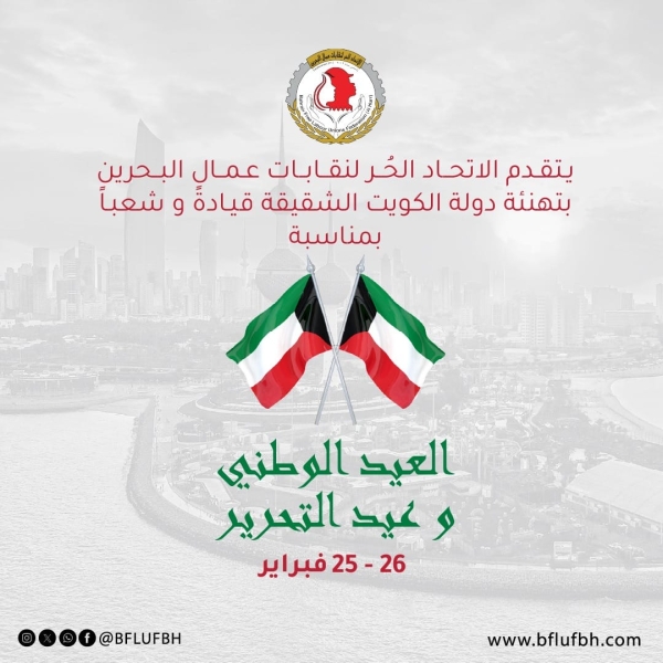 يتقدّم الاتحاد الحُر لنقاباتعمال البحرين بأسمى آيات التهاني والتبريكات إلى دولة الكويتالشقيقة قيادة وحكومة وشعباً، بمناسبة ذكرى العيد الوطني وعيد التحرير، مستذكرينبكل فخر واعتزاز هذه المناسبة الوطنية الغالية التي تجسد معاني السيادة والكرامةوالتلاحم الوطني.