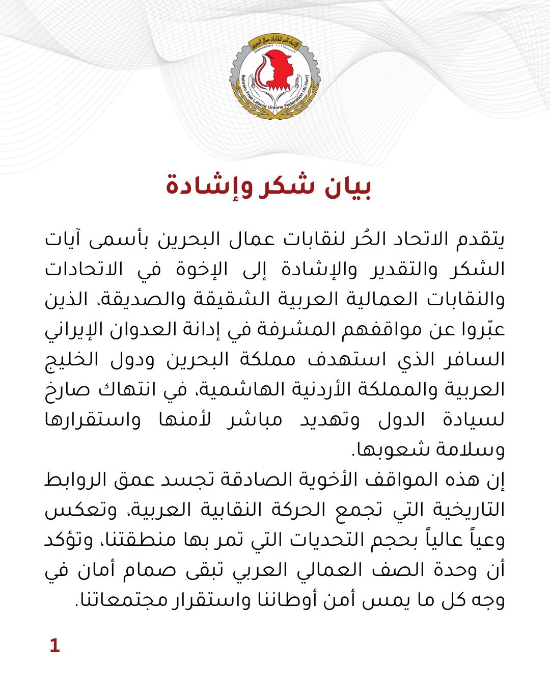 يتقدم الاتحاد الحُر لنقابات عمال البحرين بأسمى آيات الشكر والتقدير والإشادة إلى الإخوة فى الاتحادات والنقابات العمالية العربية الشقيقة والصديقة، الذين عبّروا عن مواقفهم المشرفة في إدانة العدوان الإيراني السافر الذى استهدف مملكة البحرين ودول الخليج العربية والمملكة الأردنية الهاشمية، في انتهاك صارخ لسيادة الدول وتهديد مباشر لأمنها واستقرارها وسلامة شعوبها.