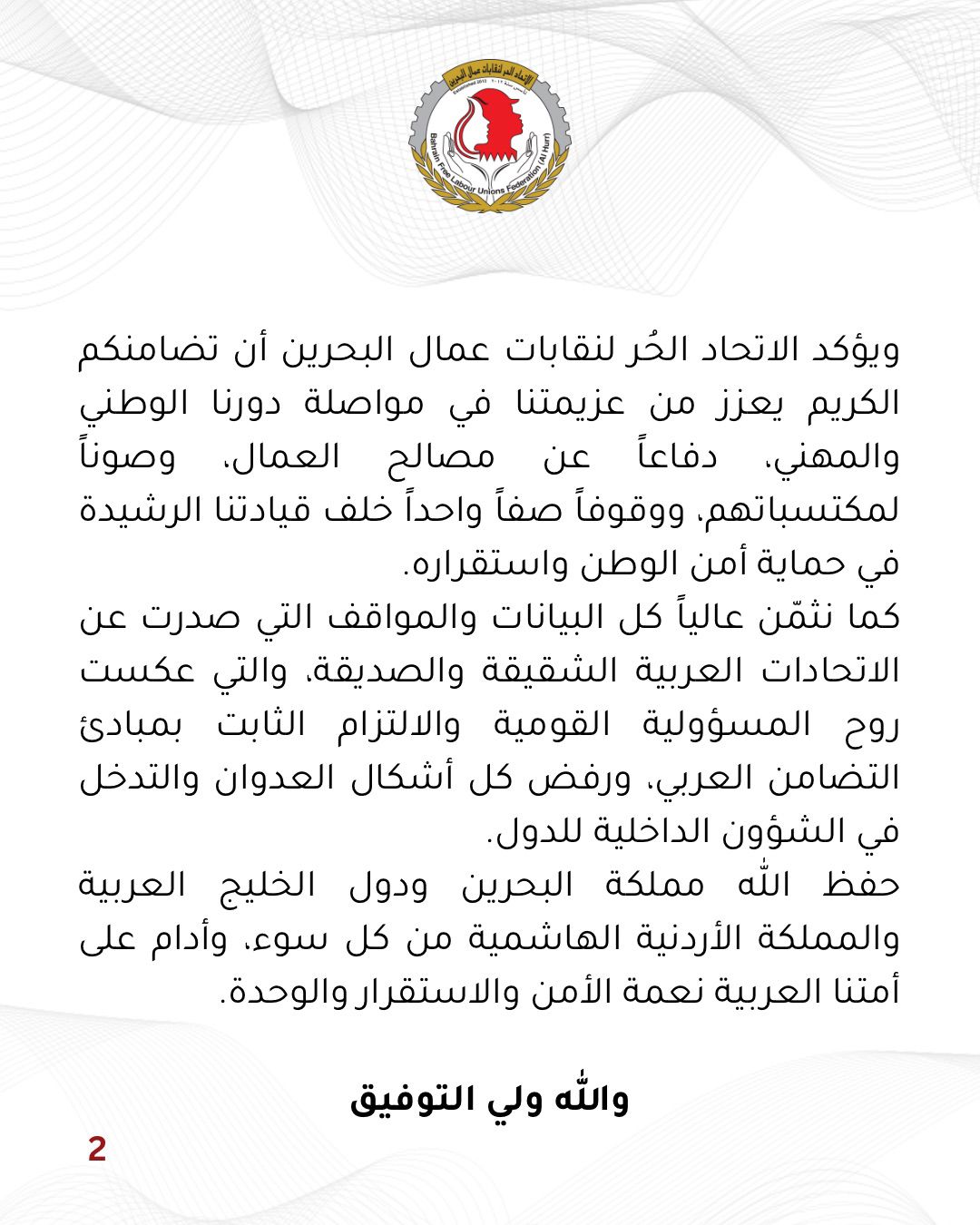 ويؤكد الاتحاد الخر لنقابات عمال البحرين أن تضامنكم الكريم يعزز من عزيمتنا فى مواصلة دورنا الوطني والمهني، دفاعاً عن مصالح العمال، وصوناً لمكتسباتهم، ووقوفاً صفاً واحداً خلف قيادتنا الرشيدة