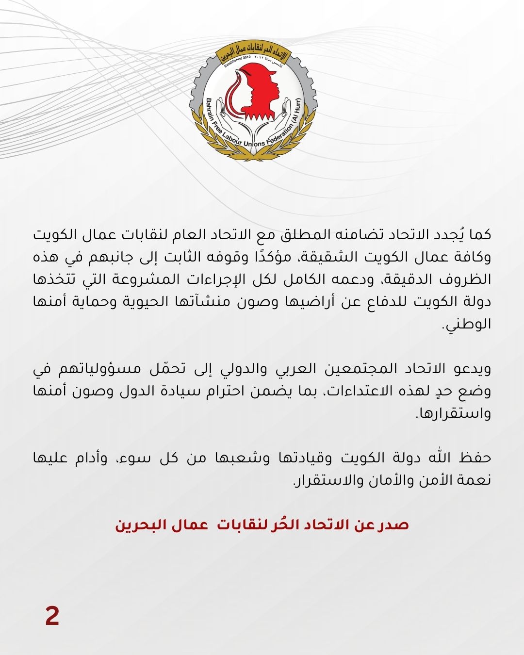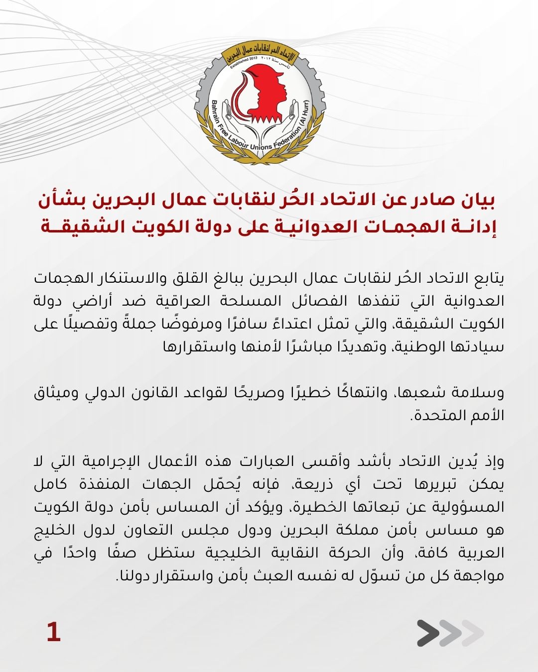 يتابع الاتحاد الحُر لنقابات عمال البحرين ببالغ القلق والاستنكار الهجمات العدوانية الت تنفذها الفصائل المسلحة العراقية ضد أراضي دولة الكويت الشقيقة، والتي تمثل اعتداءً سافراً ومرفوضاً جملةً وتفصيلا على سيادتها الوطنية، وتهديداً مباشراً لأمنها واستقرارها وسلامة شعبها، وانتهاكاً خطيراً وصريحاً لقواعد القانون الدولي وميثاق الأمم المتحدة.