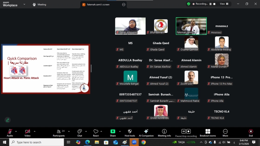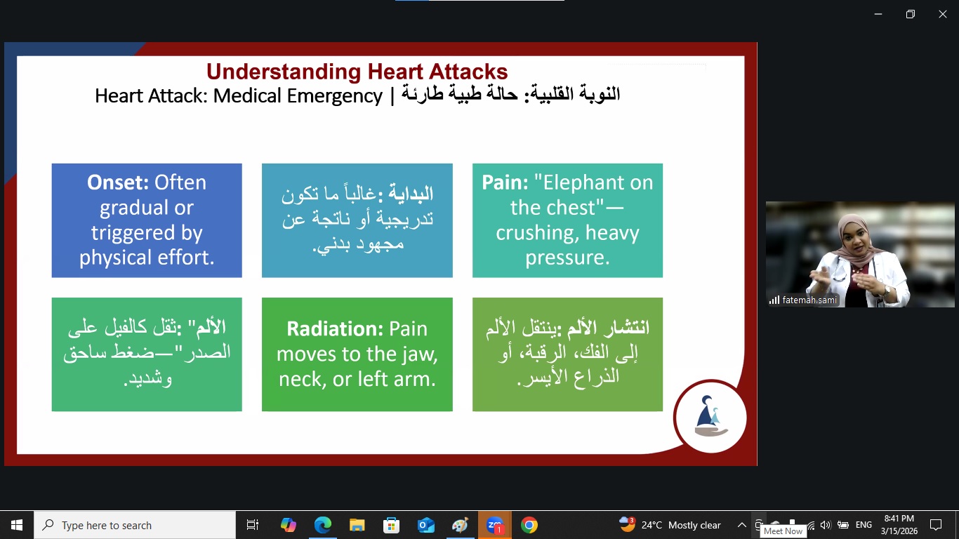 وقدّمت المحاضرة الدكتورة عشرق خليفة، حيث أوضحت الفروقات بين نوبة الهلع والنوبة القلبية، مبينة أن تشابه بعض الأعراض مثل ضيق التنفس وتسارع ضربات القلب وألم الصدر قد يسبب التباساً لدى البعض، مؤكدة أهمية عدم التهاون مع أي أعراض غير معتادة وضرورة التوجه إلى المرافق الصحية للحصول على التشخيص الصحيح.