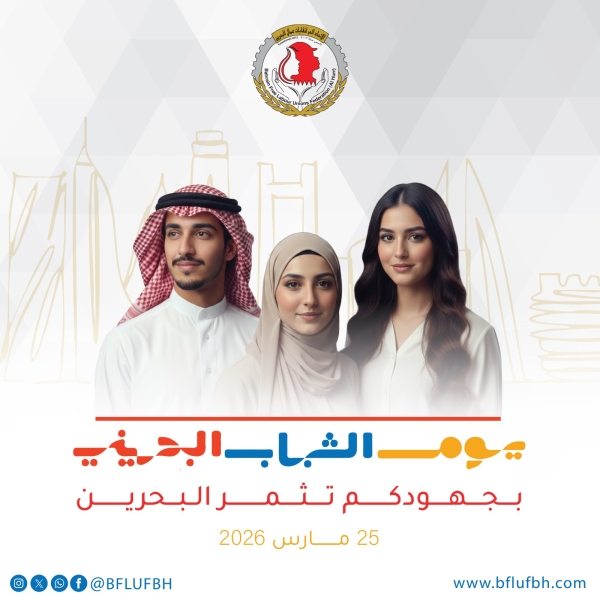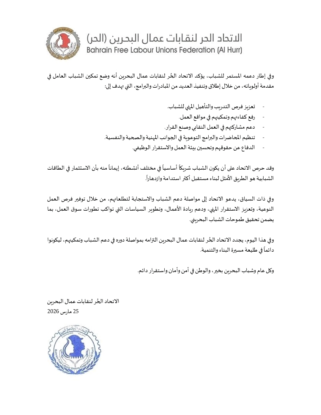 بمناسبة يوم الشباب البحريني الذي يصادف الخامس والعشرين من مارس من كل عام، يرفع الاتحاد الحُر لنقابات عمال البحرين أسمى آيات التهاني والتبريكات إلى شباب مملكة البحرين، مثمناً التوجيهات السديدة لحضرة صاحب الجلالة الملك حمد بن عيسى آل خليفة، عاهل البلاد المعظم حفظه الله ورعاه، وإلى صاحب السمو الملكي الأمير سلمان بن حمد آل خليفة ولي العهد رئيس مجلس الوزراء حفظه الله، لما يحظى به الشباب من دعم متواصل ورعاية كريمة تعكس إيمان القيادة بدورهم المحوري في مسيرة التنمية الوطنية الشاملة.