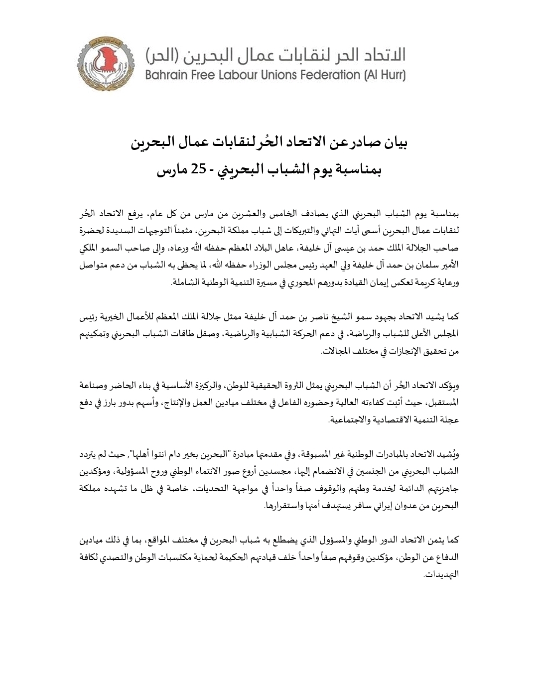 بيان صادر عن الاتحاد الحُر لنقابات عمال البحرين بمناسبة يوم الشباب البحريني - 25 مارس